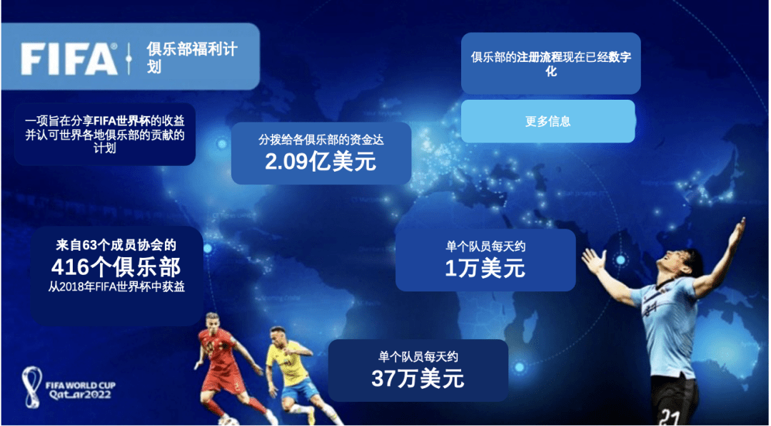 俱乐部会通过数字平台申请这些补偿,“在2022年世界杯正式筹备期间和比赛期间,球员在国家队效力的每一天都将获得约1万美元的补偿。相关足球运动员在2022年世界杯之前的两年内所效力的所有俱乐部都能获得补偿金。”