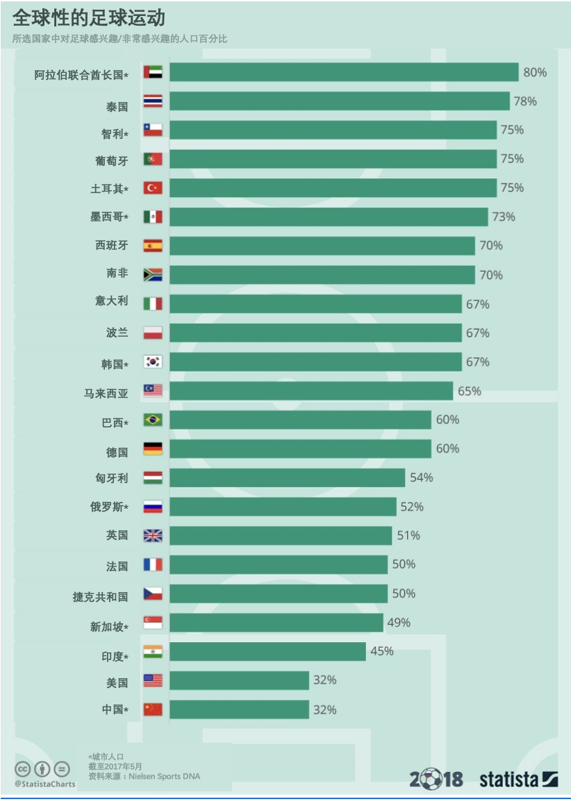 世界各地有数十亿球迷关注着俱乐部足球或国家足球。(图片来源:Statista)