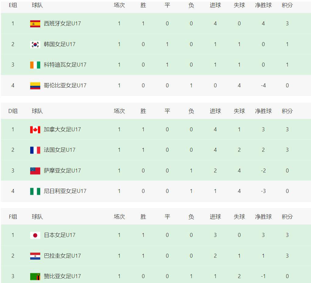 在同一小组的另一场比赛中,朝鲜以2-0战胜墨西哥,凭借净胜球的优势暂时位居小组榜首。另一方面,作为本届赛事的夺冠热门,日本队轻松以3-0战胜新西兰,延续了她们在世界杯历史上对新西兰的全胜纪录。而韩国队则在与科特迪瓦的对决中,最终以1-1的比分战平对手。