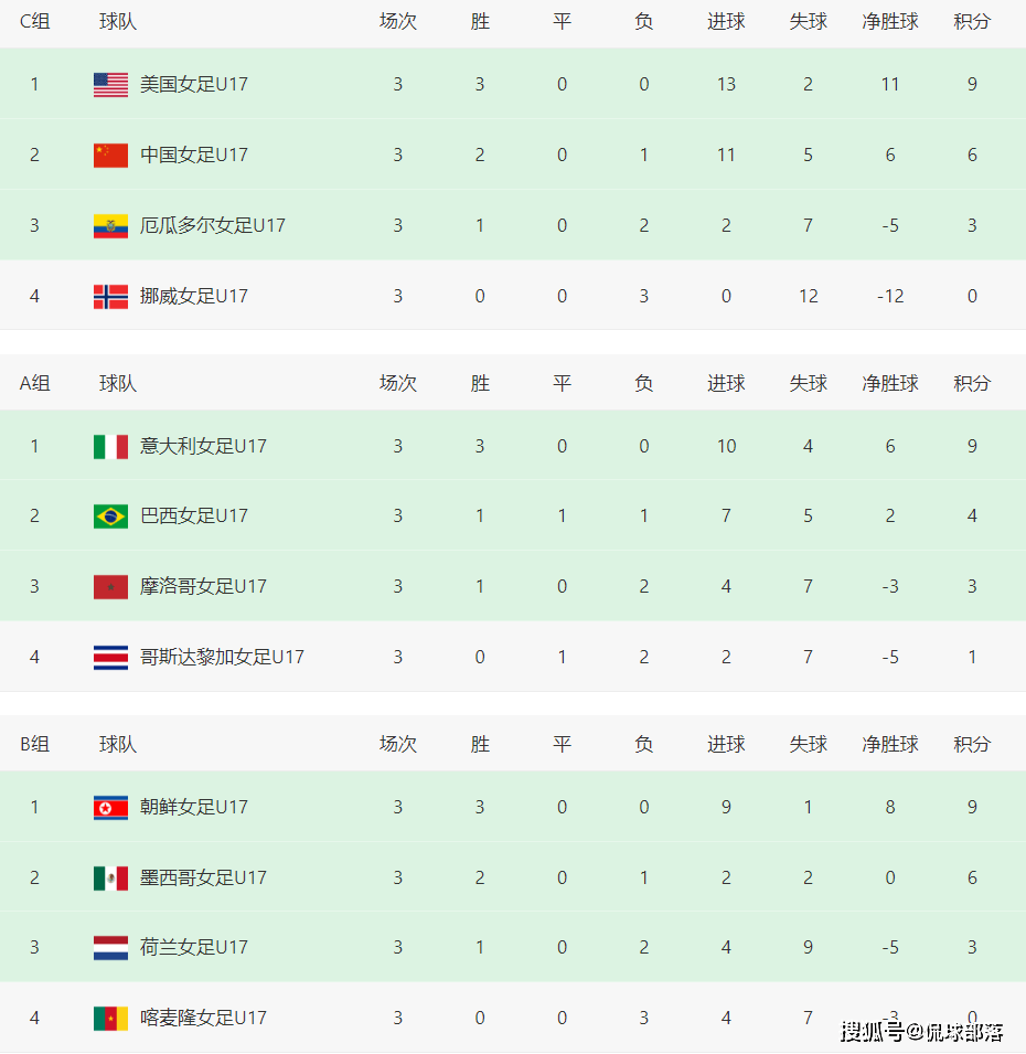 前一个比赛日,A组、B组、C组的最后一轮率先开打,中国女足4-0大胜厄瓜多尔,美国5-0狂胜挪威,意大利4-3险胜巴西,哥斯达黎加1-3输给摩洛哥,朝鲜5-0狂胜荷兰,墨西哥1-0击败喀麦隆。