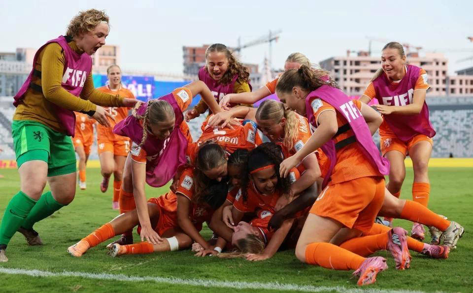 荷兰队的逆转表现令人瞩目,他们在补时阶段连入两球,成功逆转法国队挺进四强。荷兰女足所在的小组是C组,与卫冕冠军朝鲜队、墨西哥队和喀麦隆队一同竞争。尽管小组赛表现不佳,他们仅以小组第三晋级,甚至在对阵朝鲜队时以0-5惨败。然而,在淘汰赛阶段,他们如同换了一个球队,先是在1/8决赛中对阵上届季军美国队时表现出了稳固的防守实力,将比赛拖入点球大战,最终以意外的胜利晋级。与法国队的比赛同样充满戏剧性,上半场第38分钟,荷兰队先丢一球,0-1落后。临近比赛结束时,第91分钟,法国队再进一球几乎锁定胜局。但荷兰队展现了他们不屈不挠的精神,果断全员压上,在补时阶段的第93分钟和第98分钟连续进球,将比分扳平。最终进入点球大战,失去领先的法国队连续罚失两个点球,尽管随后追回一球,但荷兰队依然以7-6赢得点球大战,并以总比分9-8逆转成功晋级。荷兰女足首次参加U17世界杯便打入四强,成为本届比赛的黑马球队。