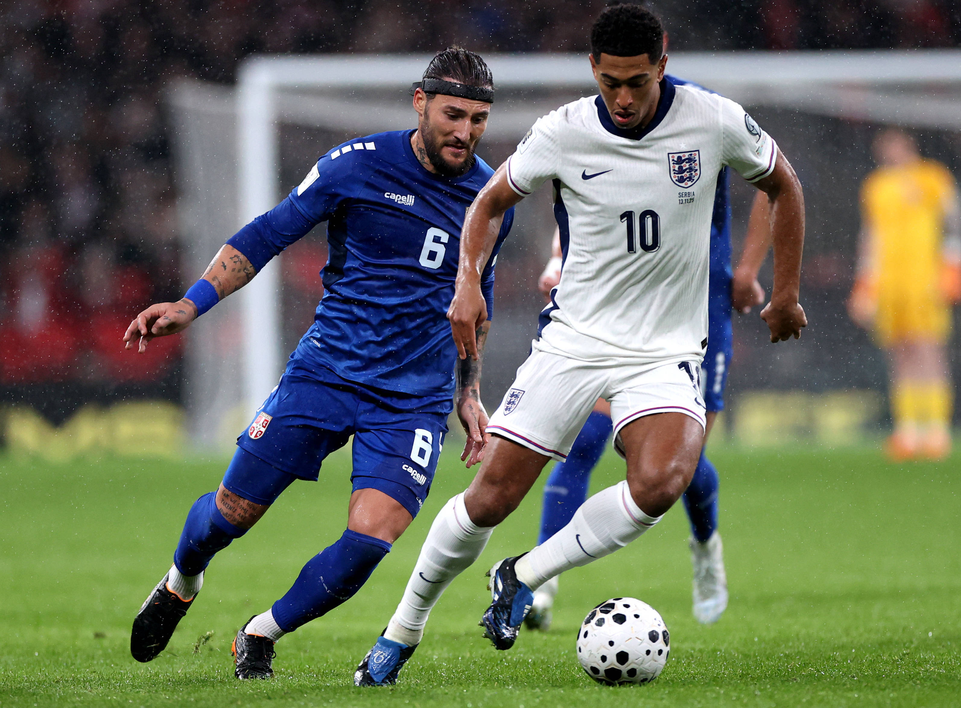 11月13日,英格兰队球员贝林厄姆(右)与塞尔维亚队球员古德利在比赛中拼抢。 新华社记者 李颖 摄