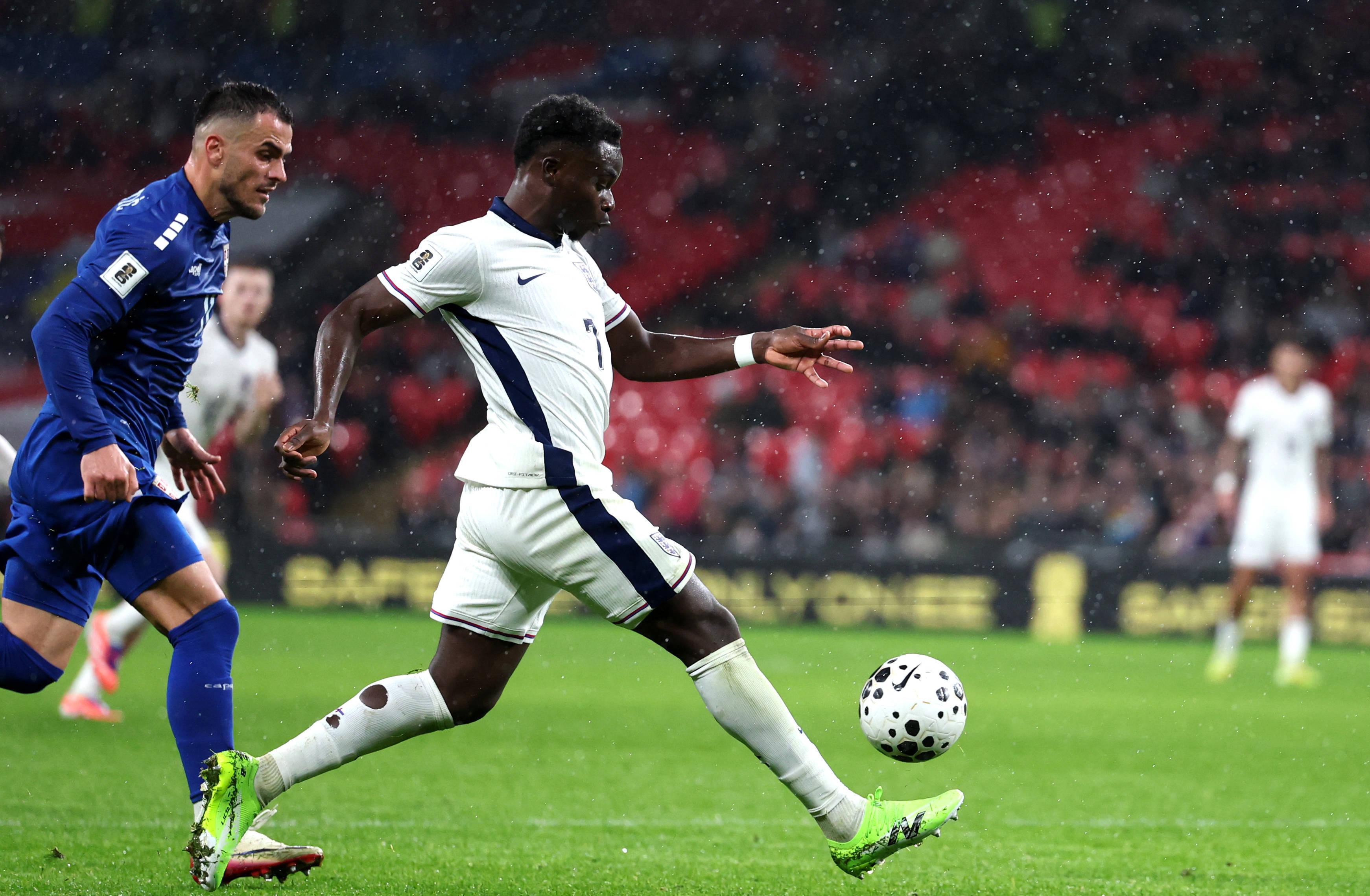 11月13日,英格兰队球员萨卡(右)在比赛中带球突破。 新华社记者 李颖 摄