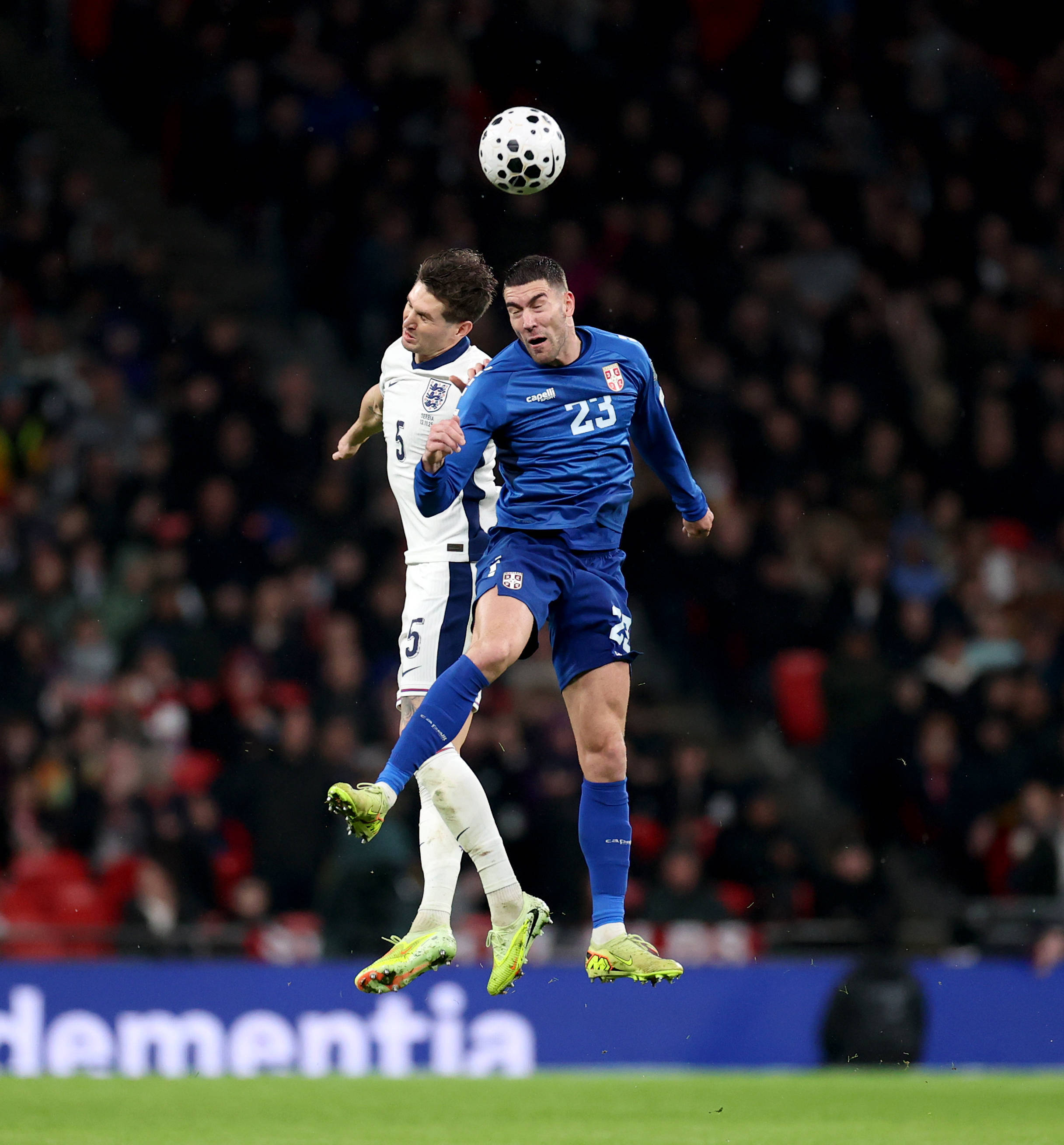 11月13日,英格兰队球员斯通斯(左)与塞尔维亚队球员弗拉霍维奇在比赛中争顶。 新华社记者 李颖 摄