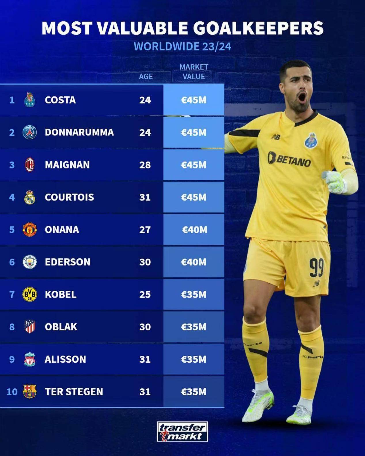迪奥戈-科斯塔,在波尔图的门前守护着球队的荣誉。虽然年纪轻轻,但他的实力早已得到了全世界的认可,他的4500万欧元身价也是实至名归。同时,巴黎的多纳鲁马也以同样的身价位列第二,他在法甲的表现牢牢抓住了人们的目光。