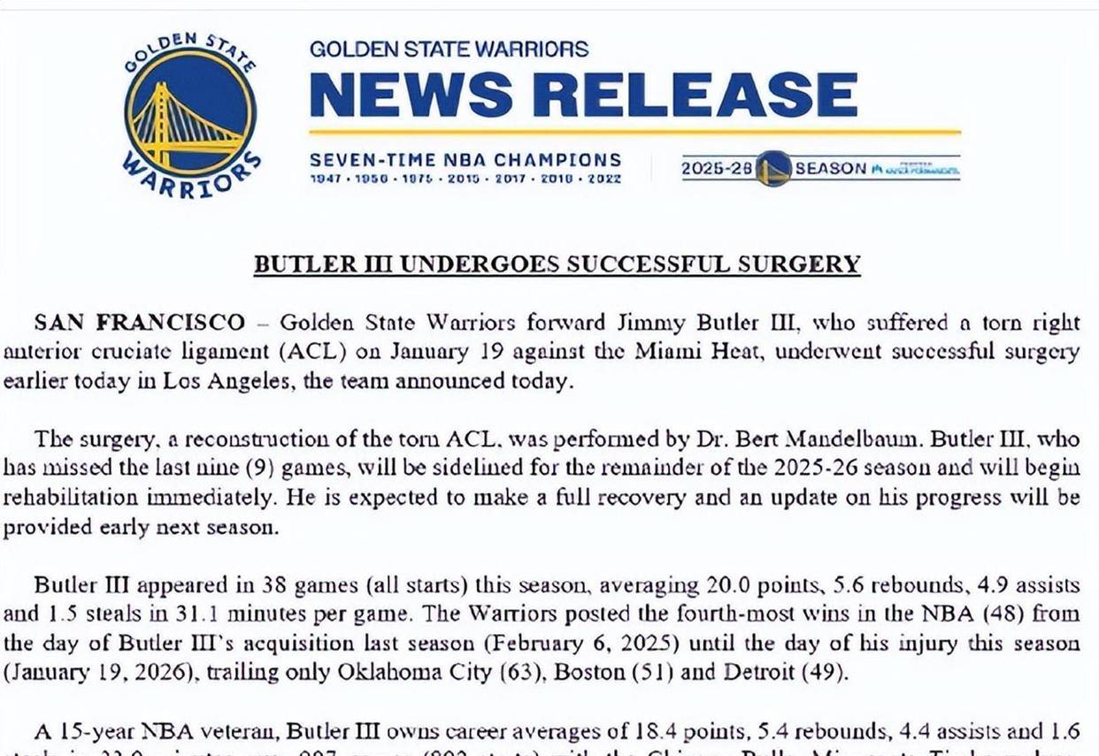 2026世界杯赛程,世界杯球队,足球预测,世界杯投注,赛事直播勇士队今天官方宣布,37岁老将吉米·巴特勒已成功接受右膝前十字韧带重建手术,确定缺席本赛季剩余所有比赛。 这次手术针对他在1月20日对阵热火时遭遇的韧带撕裂伤,由洛杉矶知名运动医学专家伯特·曼德尔鲍姆主刀。