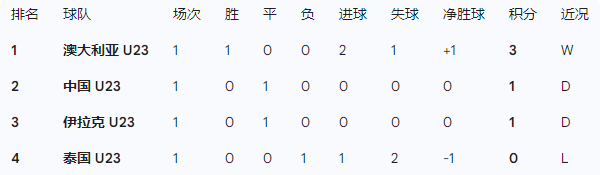 D组被公认为本届赛事的“死亡之组”,集结了澳大利亚(身体与技术结合)、伊拉克(西亚传统劲旅)、中国(战术纪律严明)和泰国(东南亚技术流)。首轮战罢,积分形势如下: